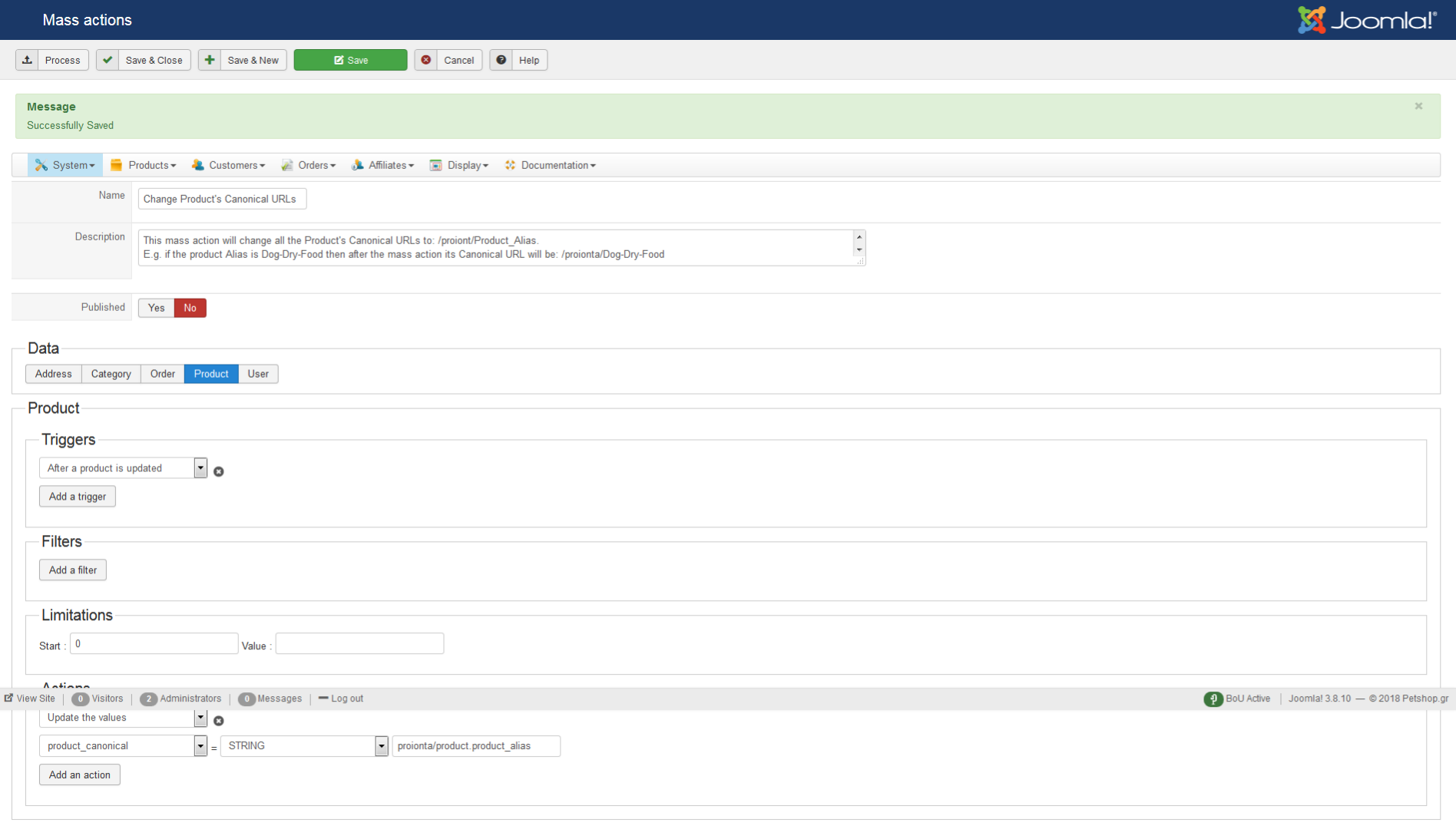 I tried to update -using mass-actions- products canonical url's value to be equal to proionta/product's alias but i get wrong Canonical URLs.