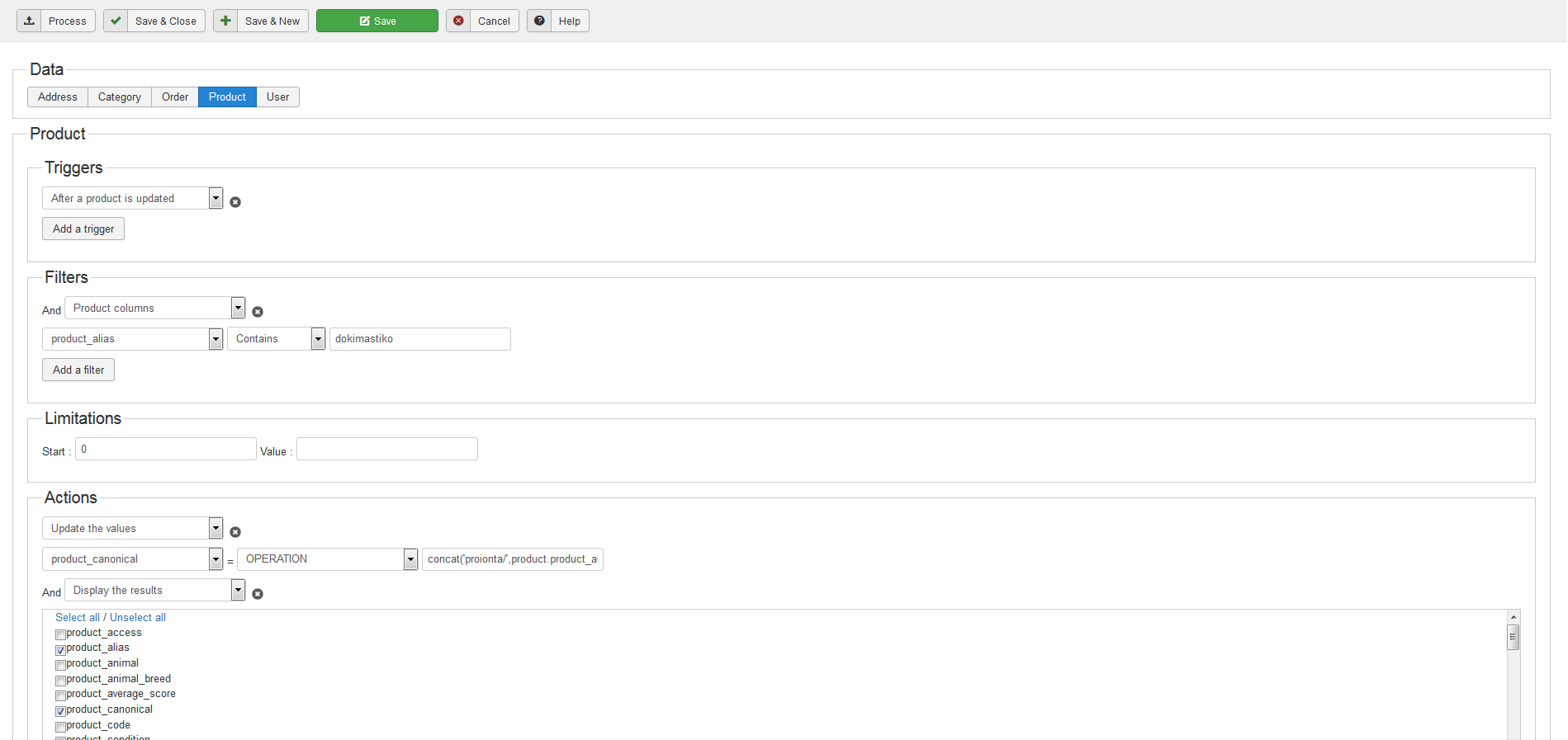 I add an action (see attachment) "Update the values", select product_canonical = STRING to proionta/product.product_alias ( also experiment with proionta/product_alias or product_alias)