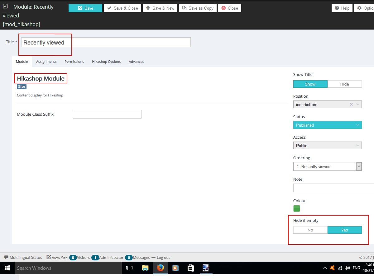 I have attached two screen shots showing and proving that there is a hide if empty function within your Hikashop developed module.