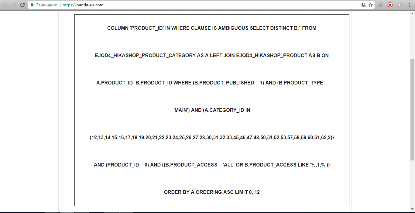 Column 'product_id' in where clause is ambiguous SELECT DISTINCT b.* FROM jos_hikashop_product_category AS a LEFT JOIN jos_hikashop_product AS b ON a.product_id=b.product_id WHERE (b.product_published = 1) AND (b.product_type = 'main') AND (a.category_id IN (2)) AND (product_id = 0) AND (b.product_quantity!=0) AND ((b.product_access = 'all' OR b.product_access LIKE '%,9,%')) ORDER BY a.ordering ASC LIMIT 0, 4