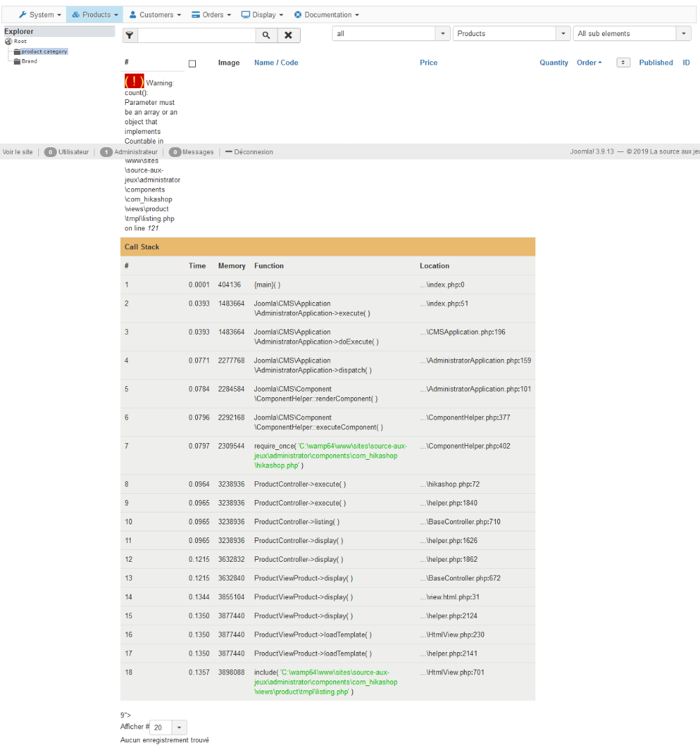 -- Error-message(debug-mod must be tuned on) -- : Warning: count(): Parameter must be an array or an object that implements Countable in C:\wamp64\www\sites\source-aux-jeux\administrator\components\com_hikashop\views\product\tmpl\listing.php on line 121