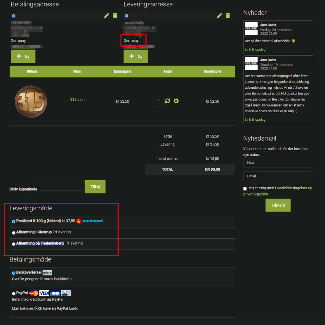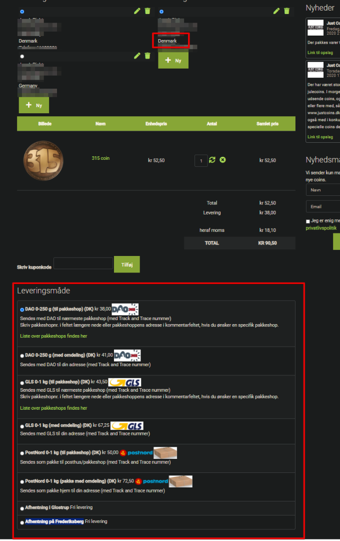 If I select another country in the country list (shown above with a red arow), then the shipping options do not change according to the selected country.