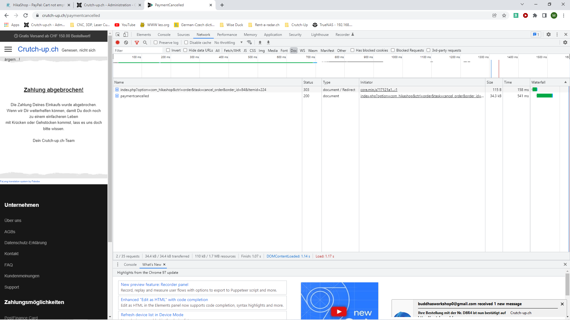 A) The shopping cart is not emptied upon return from a succesful PP-payment (the solution of emptying the cart upon creation works, but is not ideal, since it should also work in the case when PP confirms the payment, which obviously works, otherwise no e-mail would be sent). If the payment with PP doesn't succed, I don't want my customers having to refill the cart...