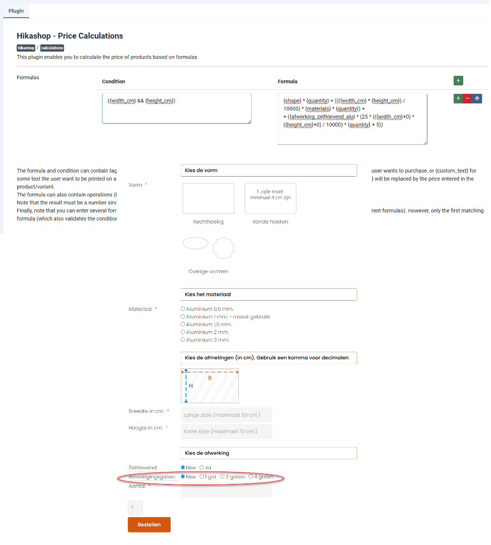 We are selling aluminium plates with the option to add holes. Each hole costs €0.05, but to start this process we need to add a one-time starting cost of €10. We created a custom field {afwerking_boorgaten_alu} see screenshot.