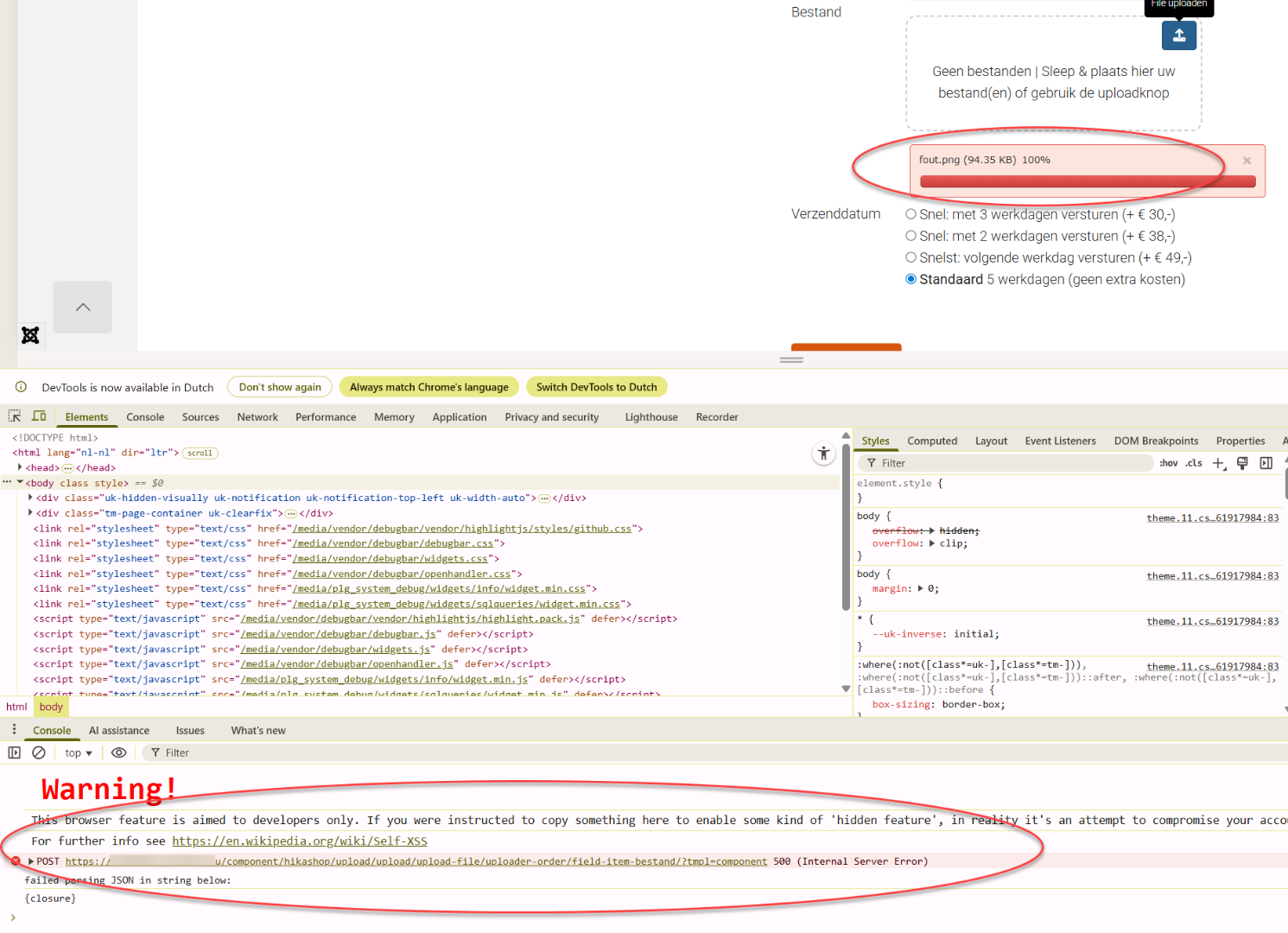 Then, in the developer tools of your browser, look at the HTTP request with the 500 status code and check its response from the server. It should hopefully contain the error message along with the call stack etc.