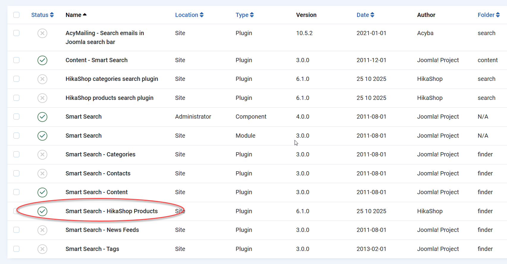 The issue appears only when the HikaShop Products Smart Search plugin is enabled.
