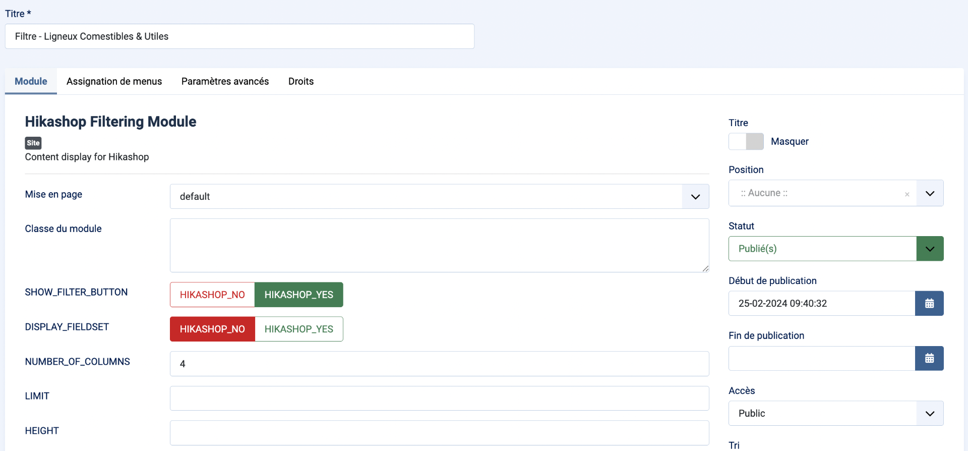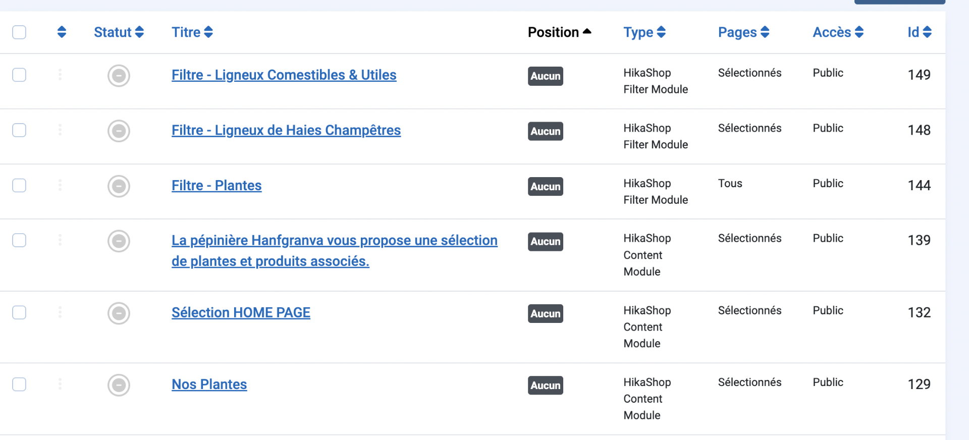 Plusieurs modules HikaShop (Filter Module / Content Module) apparaissent comme inactifs / non opérationnels alors qu’ils sont bien en statut “Publié”,