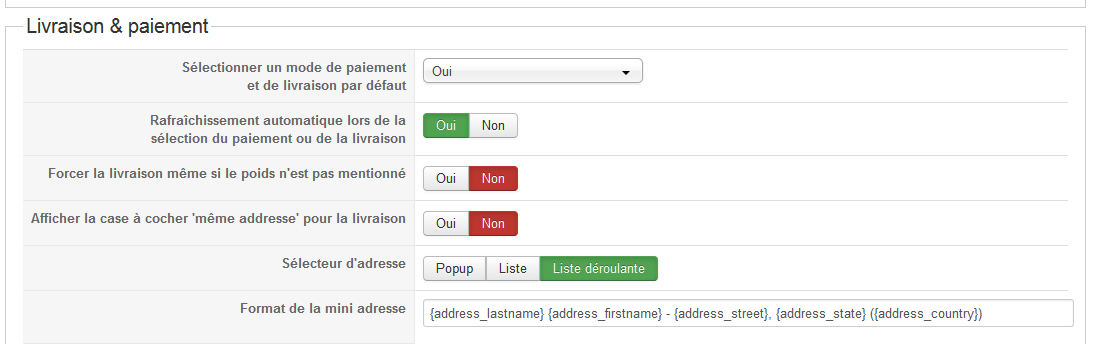 Voici une copie d'écran de la configuration paiement/livraison.