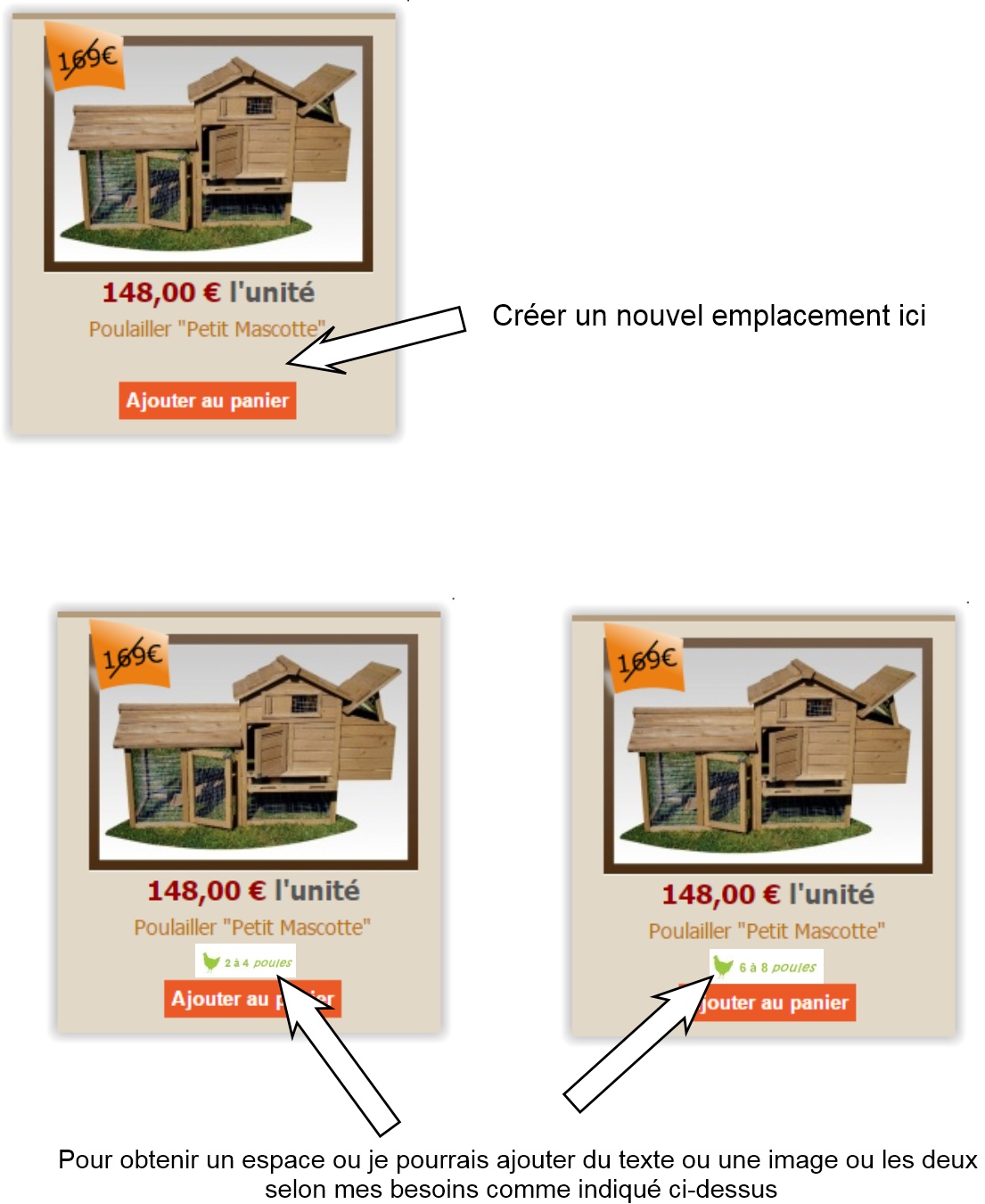 Les produits qui sont à vendre apparaissent dans des modules avec un bouton "ajouter au panier" et au dessus, selon les besoin, la quantité. J'ai supprimé l'affichage de la quantité pour des raisons perso mais j'aimerais mettre à la place un module dans lequel je pourrais ajouter du texte et/ou image, selon chaque produit.