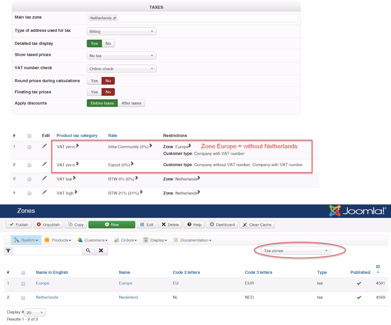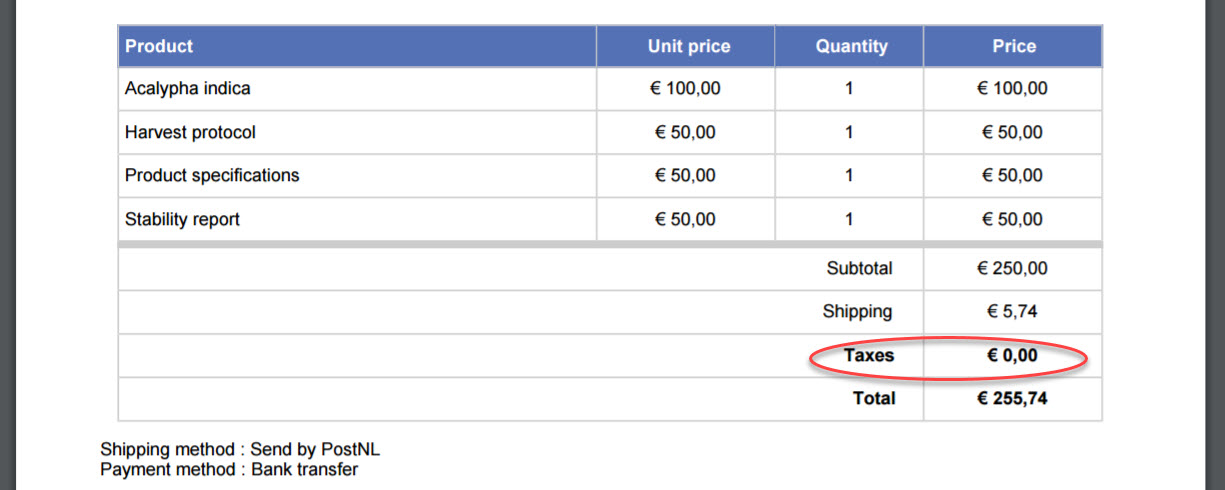 I have two tax rates with different names (for EU- and non EU-Customers) both set to 0%.