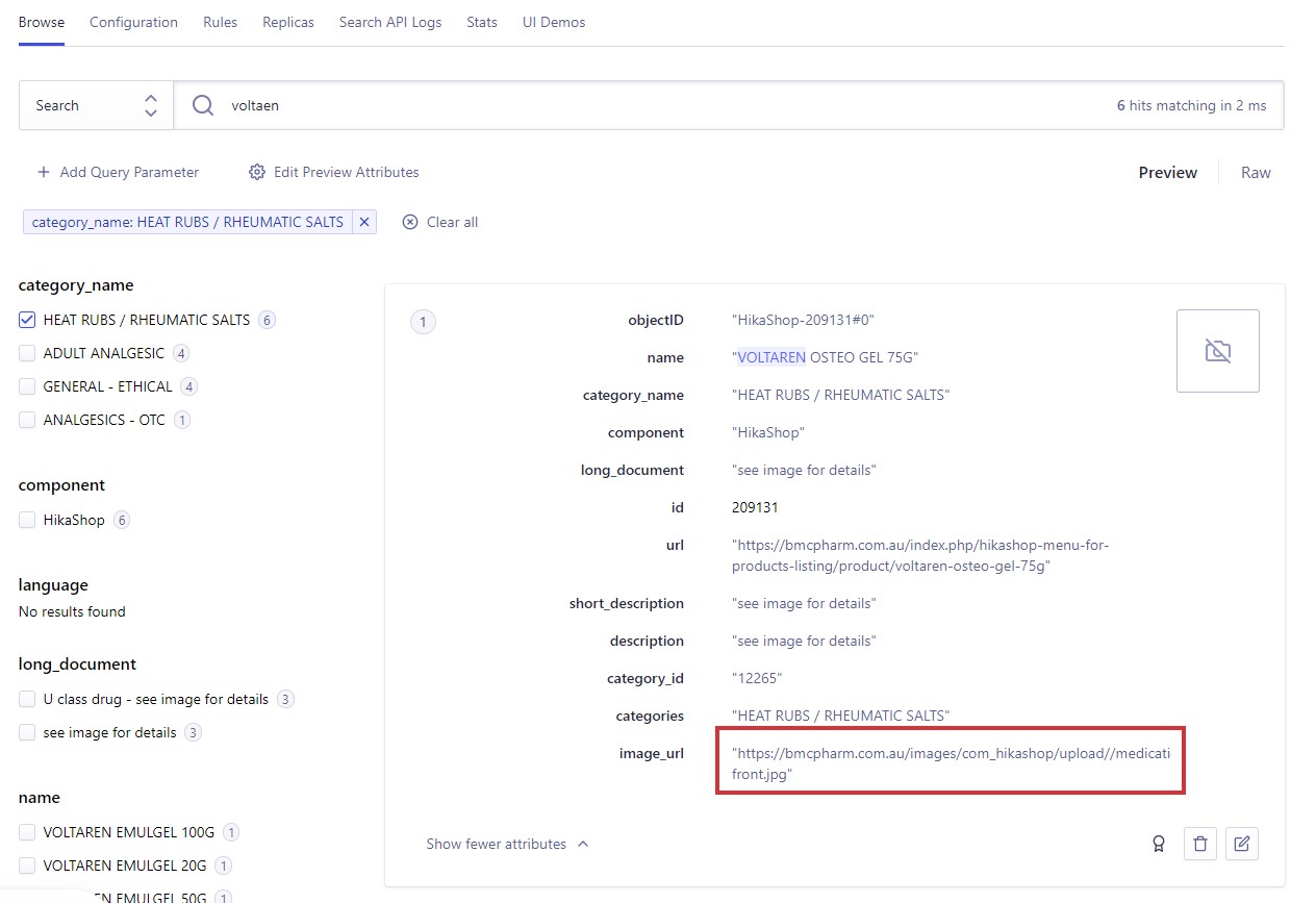 edit: Algolia seems to find the information but can't use it. There's and extra slash in the image url. Here's the record data;
