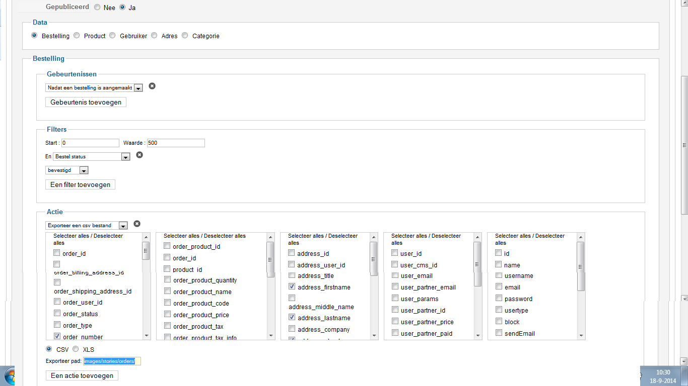 2. When i add images/stories/orders/ to the export pad nothing is happening after a customer confirmends an order. If i understand it correct the massaction should create a csv file in this folder. Is the pad wrong or are the settings wrong? i ad an printsreen of the settings just to be sure.