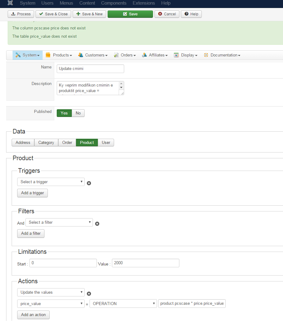 When i execute this mass action, it says that these tables and columns does not exist,