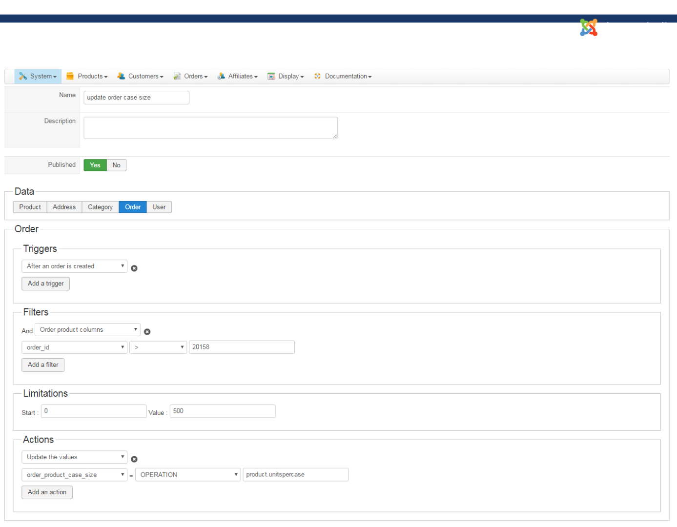 Hello, I am trying to setup mass actions to take a value from a custom field in the product table and save it with the order product data in the Order_Product table. I have created a custom field called "order_product_case_size" under the option for table = "item" and I can see the column in the database in the right table. Below is the screenshot of my mass action settings (which I am sure are not right).
