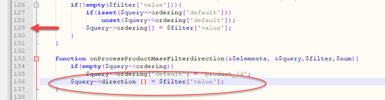 No, the lin 129 is correct. $query->direction is supposed to be an array.