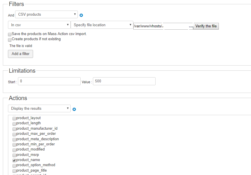 an error 1064 (info debug attached) is generated when I perform a mass action (display product) using as a filter a csv file import (see attached) that contains only the column product_code and only one record, and format UTF8.