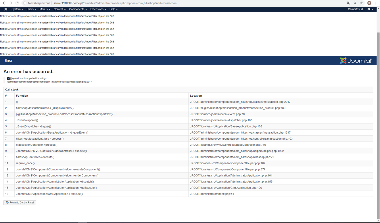 Additionally even if I deleted custom field with column name “category” but I left in mass action set any of the field from category group (for example category_name) the problem still occurs – I think this is because information about the custom field with column name “category” still exist in product data – after deletion custom field is not visible in Product data in Hikashop backend but is still kept in SQL database in the table hikashop_product. So to solve the problem not only custom field with column name “category” has to deleted but also all products, which were previously assigned to Hikashop product categories, which were assigned to this custom field ( in the block “Restrictions” in custom fields parameters).