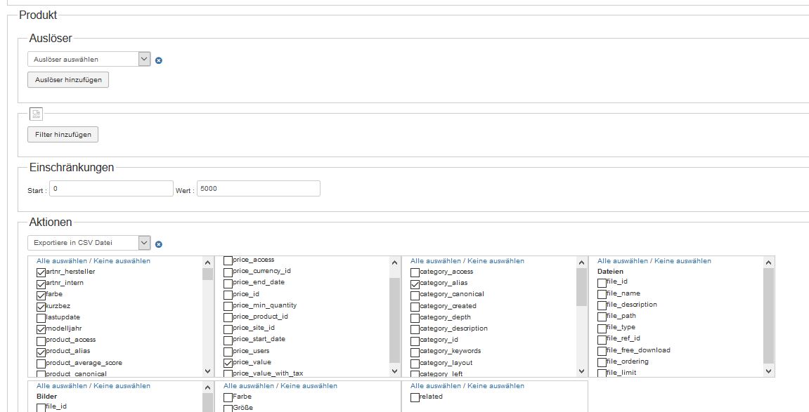 After de-selecting the fields in Prices / Categories the action is running.