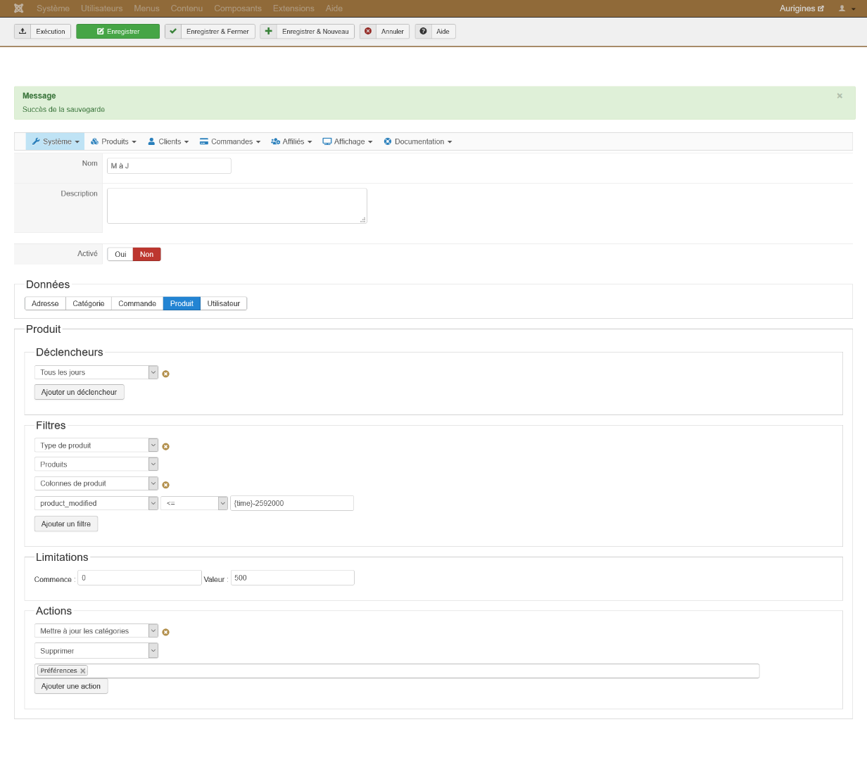 - vous utilisez product_modified et donc le système prendra en compte la date de la dernière modification du produit et non la date d'ajout de la catégorie. Il suffit donc que vous changiez quelque chose au produit dans les 30 jours pour remettre à zéro le compteur des 30 jours. Malheureusement, je n'ai pas mieux à proposer. Ce que vous pourriez bricoler, c'est de créer un champs personnalisé pour stocker la date d'ajout de la catégorie "préférence". Ensuite, vous pourriez faire une mass action pour copier la valeur de product_modified dans ce champs quand ce champs est vide et que le produit est dans la catégorie "préférence". Et dans votre première mass action, vous utiliseriez alors ce champs au lieu de product_modified, et vous auriez une seconde action pour vider la valeur de ce champs (pour la prochaine fois).