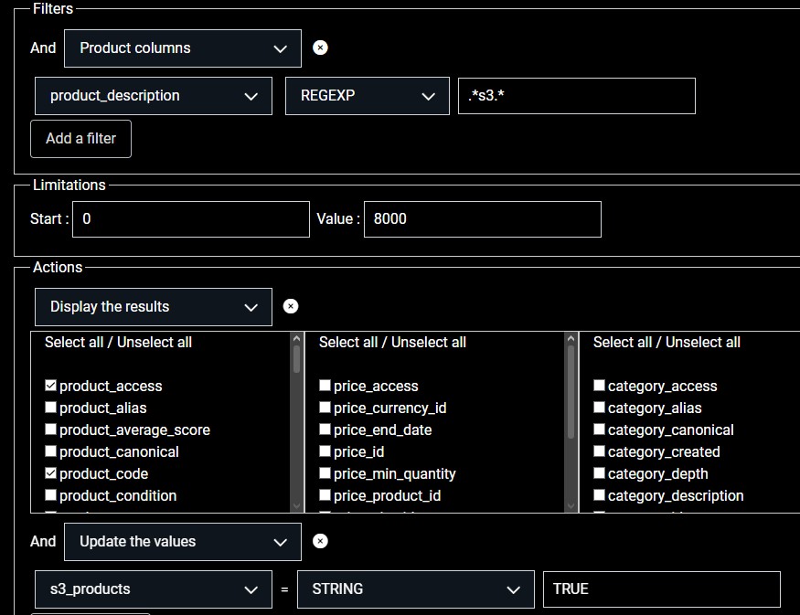 The issue comes from your regex pattern .*s3.*. In MySQL, REGEXP already matches anywhere in the string, so the .* on both sides is redundant. It forces the regex engine to consume the entire description text and then backtrack through it, which on long HTML descriptions triggers MySQL's regex timeout. That's why changing the limitation from 8000 to 1000 didn't help because the timeout happens on individual product descriptions, not on the total number of products processed.