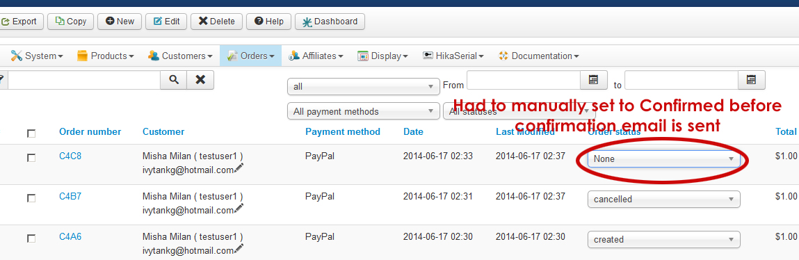 I have to go into "Orders" and manually set the status from "None" to "Confirmed" before the confirmation email is sent. Then, the most disturbing thing is that when I do this, HikaSerial's gift certificate (Coupon containing QRcode and serial) is not generated for the purchase.