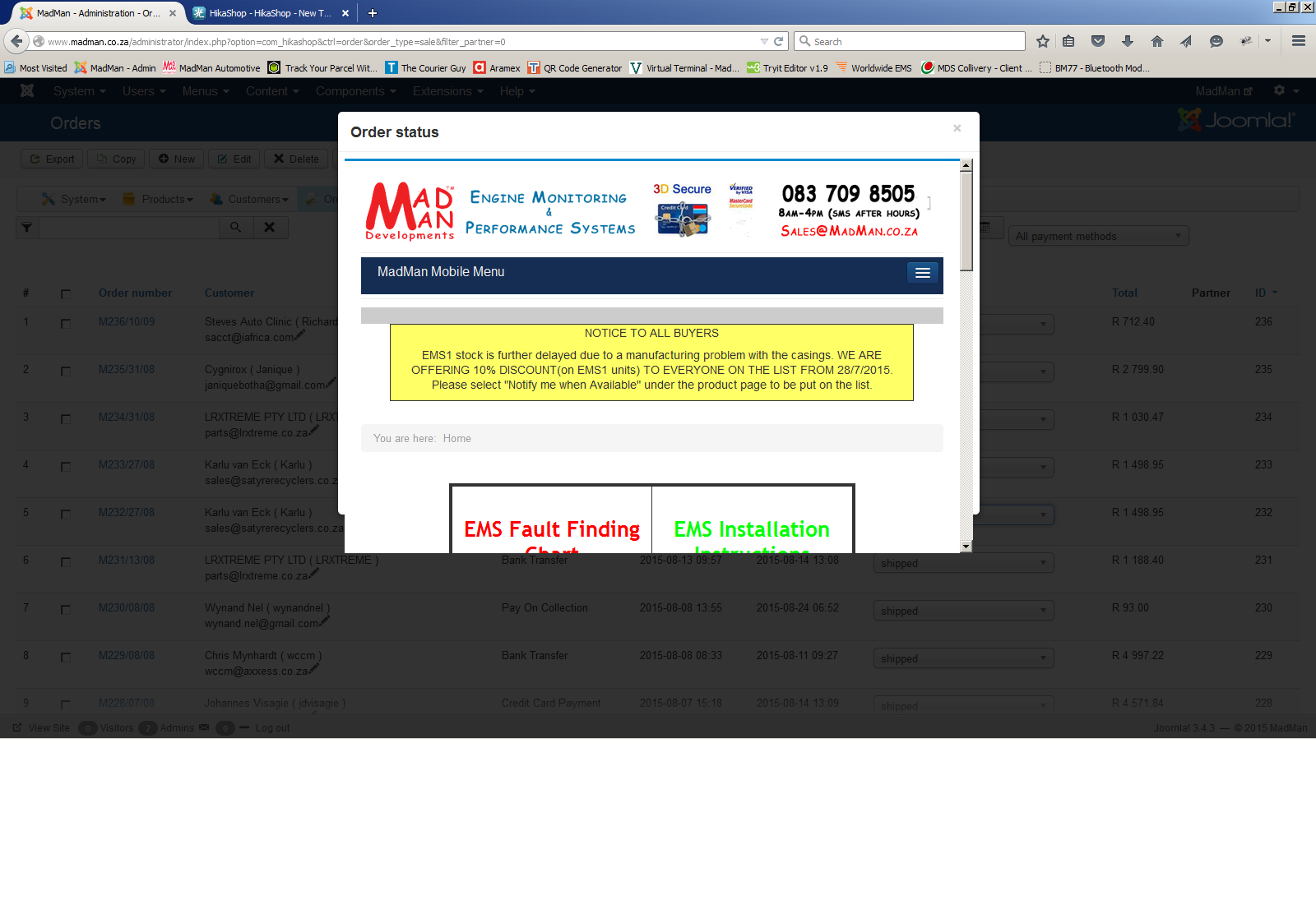 Now, when I want to change the order status of the order in Hikashop using the dropdown list, when I click onthe selection, the screen darkens and a modal-type popup pops up with a heading "Order Status" but displays the front page of my website with the mobile menu (smaller screen size triggers mobile menu) so now I cannot change the order status.