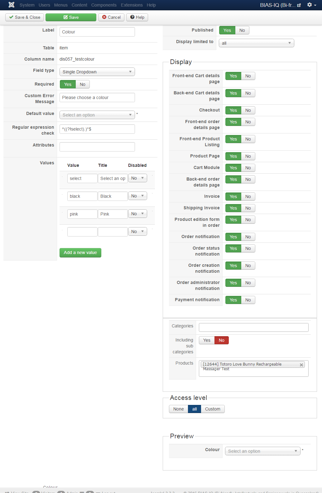 There are 23 items that have a custom field applied to them from the back end of Hikashop. These custom fields are of the "ITEM" table type and allow the user to select a value for "colour" or "size" usually. They are all the "single dropdown" type and have multiple values to select from. The default value always starts as "Select" "Please select an option". I have entered a "Regular expression check" of "^((?!select).)*$" on each custom field so that it does not let them leave it on the "select an option" option, it forces them to change it before adding to cart.
