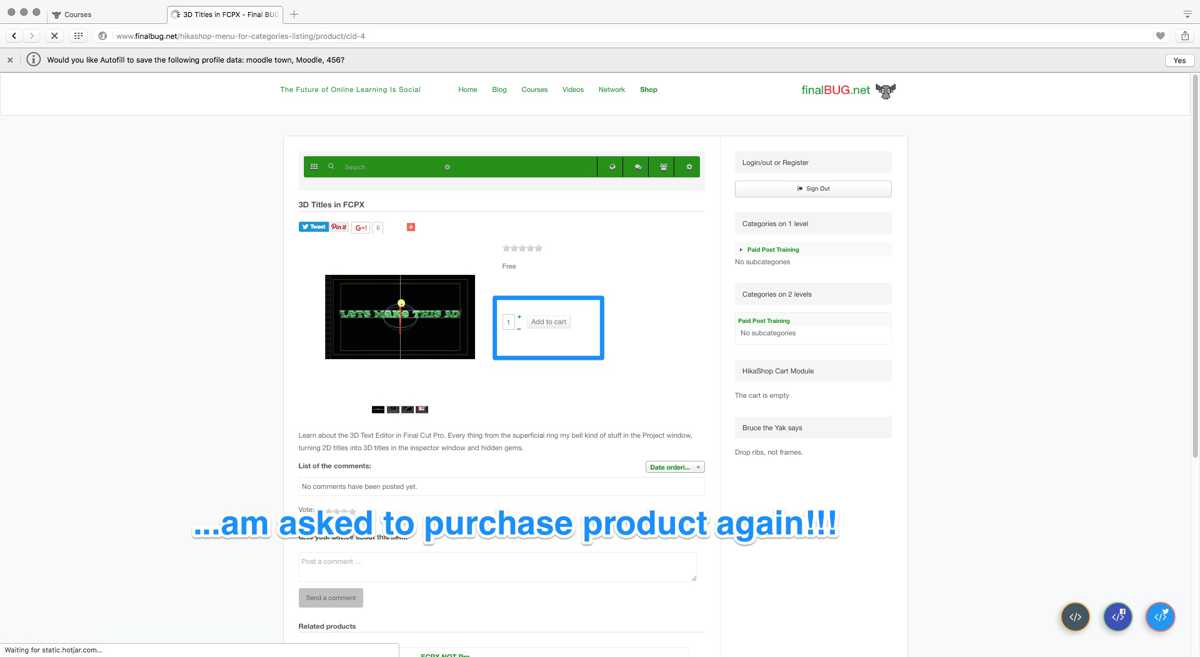 I am attempting to sell tutorials so you might want to return to the tutorial to watch it. This is why I was thinking the way I was. In my innocence I thought that once I had bought a product I could navigate to it via the Hika Products menu. Where I would see NO “Add to Cart” button. Thus clicking on the product would take me to it. In my case video tutorials as seen in the first screen shot below…