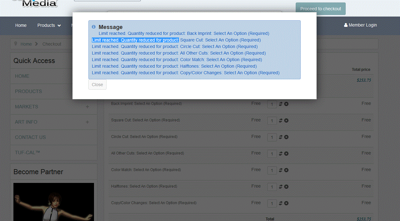 d.) Go to your primary product page, select a quantity of 2 or more and ad it to the cart. The product and the option should go to the cart and this error message should appear "Limit reached. Quantity reduced for product:" (that's the option) There should be 2 or more primary products in the cart and only 1 of the option.