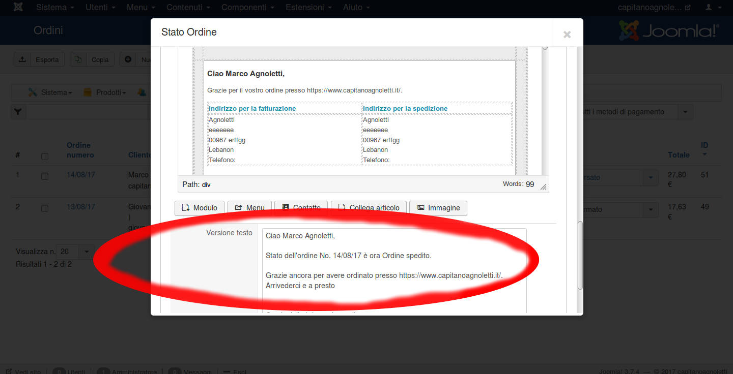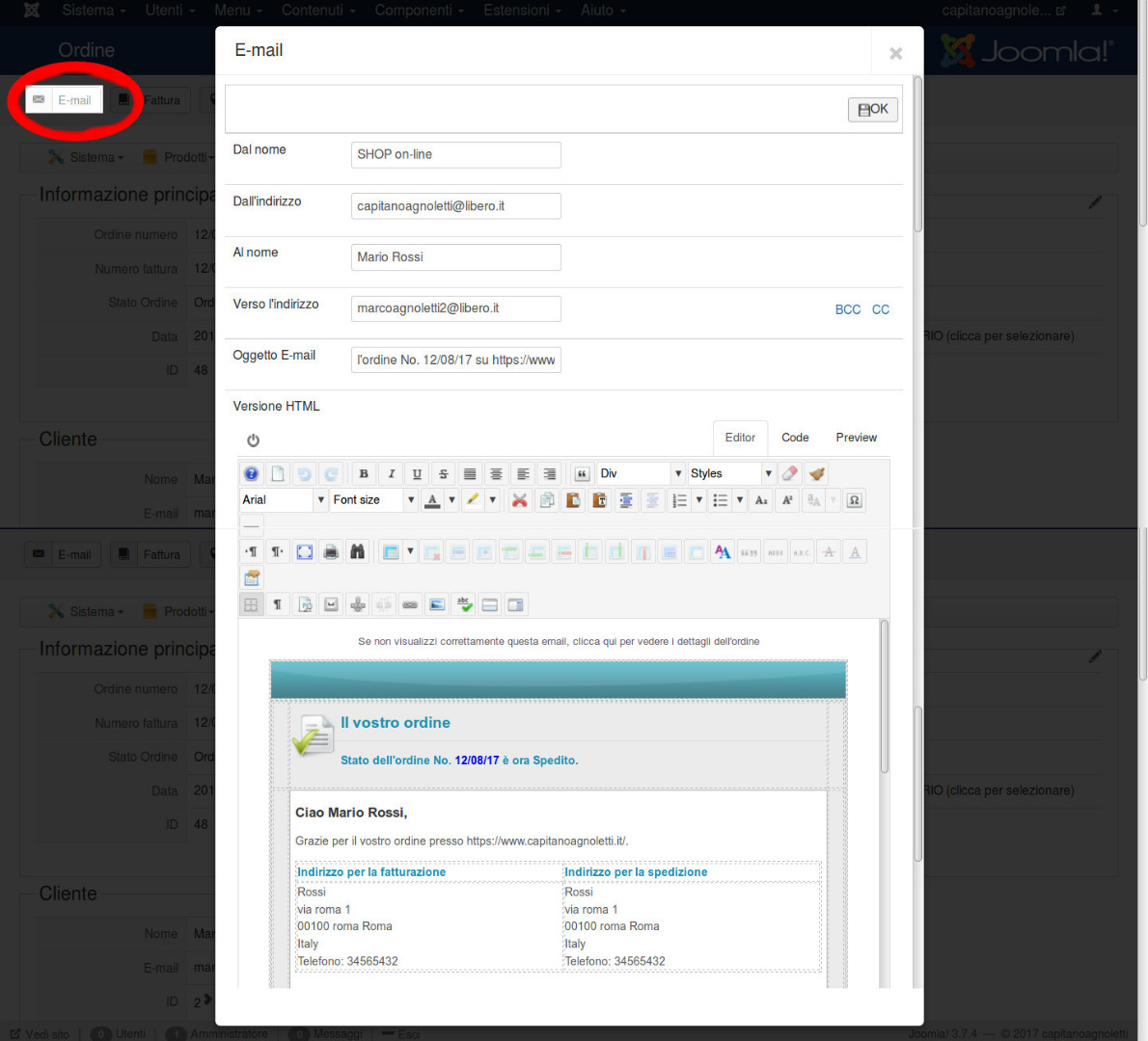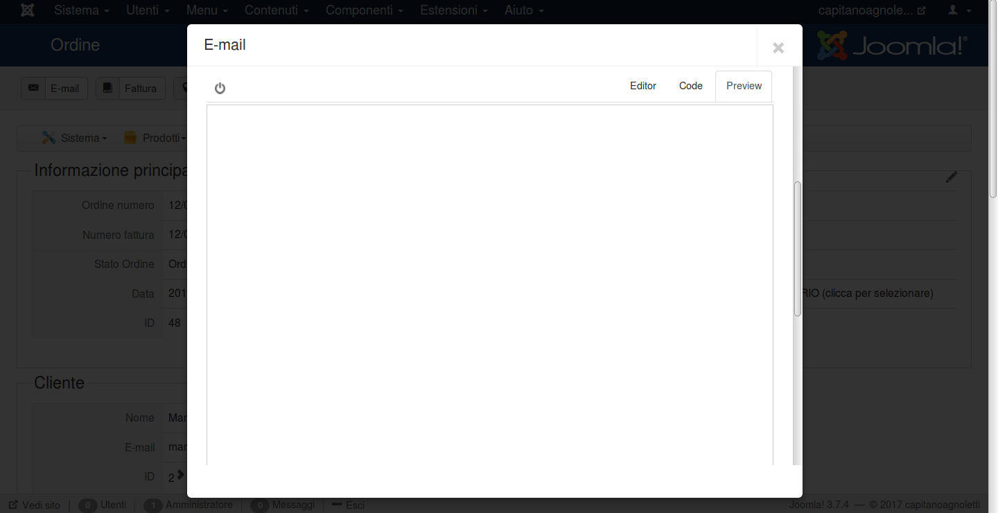 When I enter the order details (attached picture no. 2), after having clicked the box "Email" in the top left corner (attached picture no. 3) I can see the text the customer should receive (attached picture no. 4), but when I click on "Preview" I actually see no text (attached picture no. 4), as it really happens.