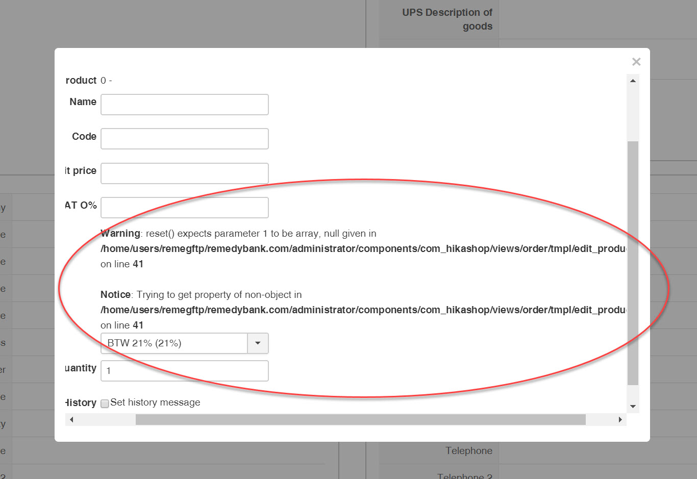 Notice: Trying to get property of non-object in ....../administrator/components/com_hikashop/views/order/tmpl/edit_products.php on line 41