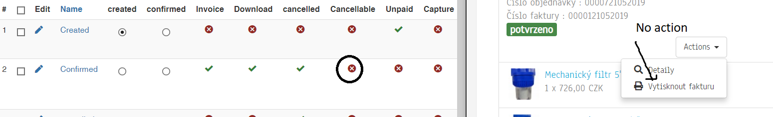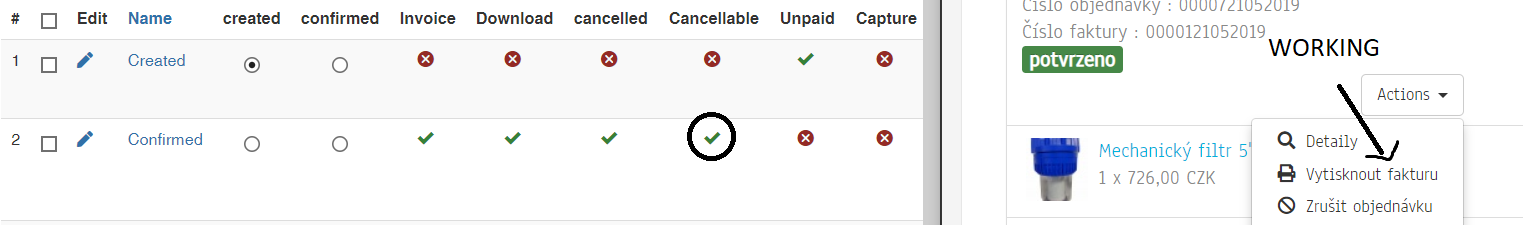 today I bought Hika Shop essential and I found a problem. In the customer area when placing an order and confirming it, the button Print Invoice does not react at all (image 1). However by chance I tried to change the configuration in Order statuses to Cancellable (image 2, showing the cancel order button at front end) and suddenly the pop-up window appears. However I don't want to have to Cancellable order status at all, therefore I am asking, whether somebody knew, where is the problem?