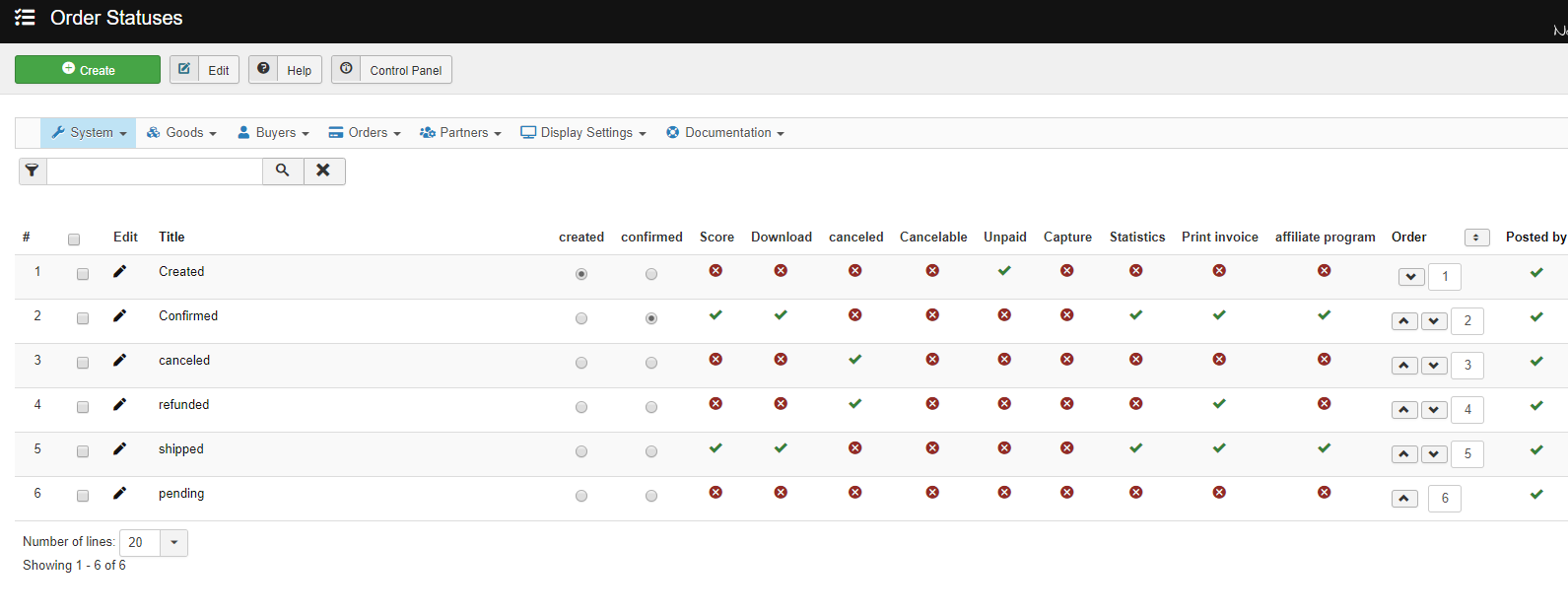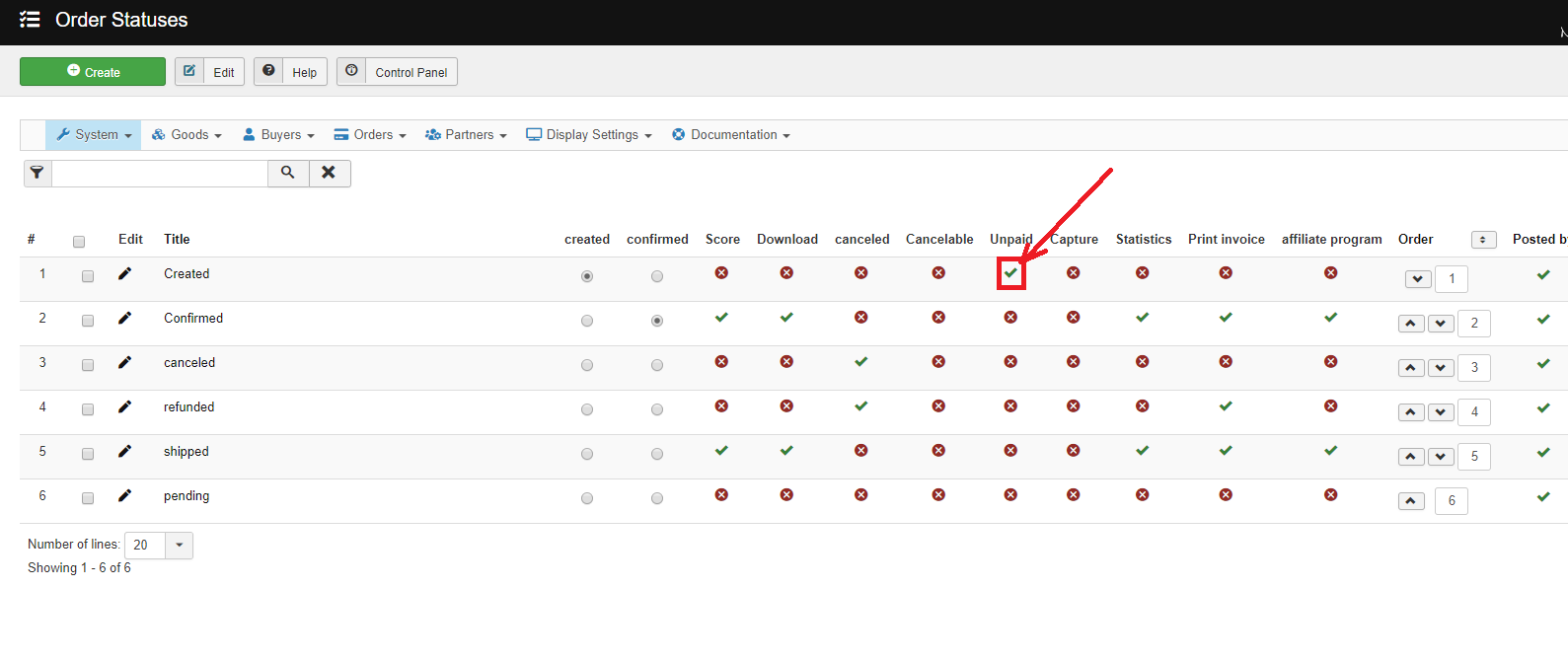 Then, you want to go in the menu System>Order statuses and check that the order statuses are correctly configured. The payment of orders is only possible when the status of the order is equal to one of the enabled order statuses under the "unpaid" column there.