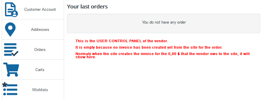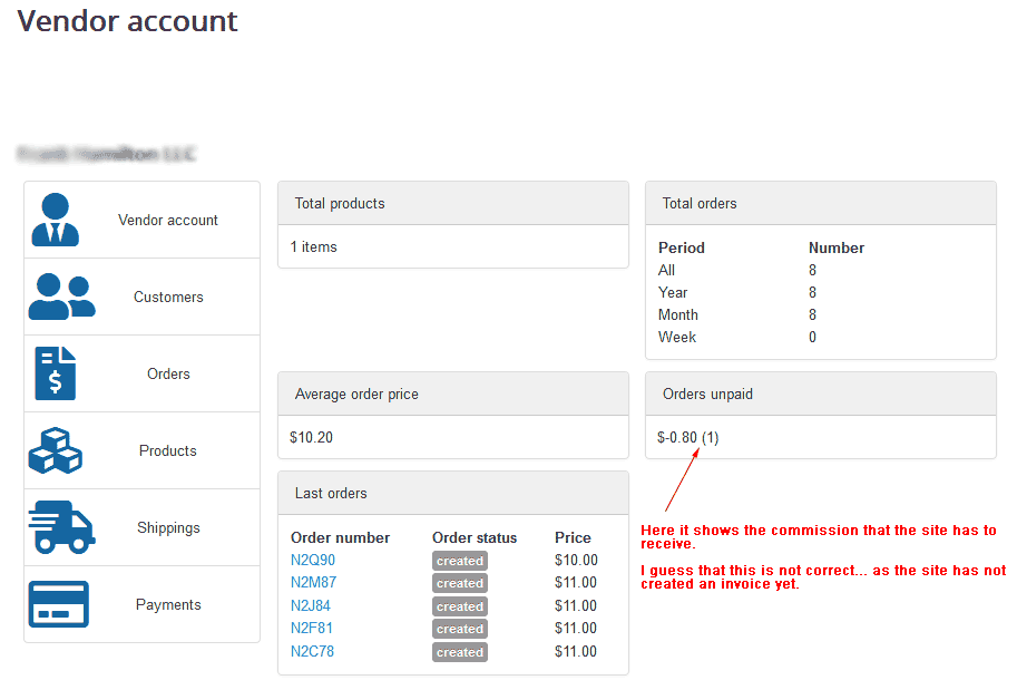 So the Vendor owns 0,8 $ to the site. The vendor at the frontend can see the following when he visits the