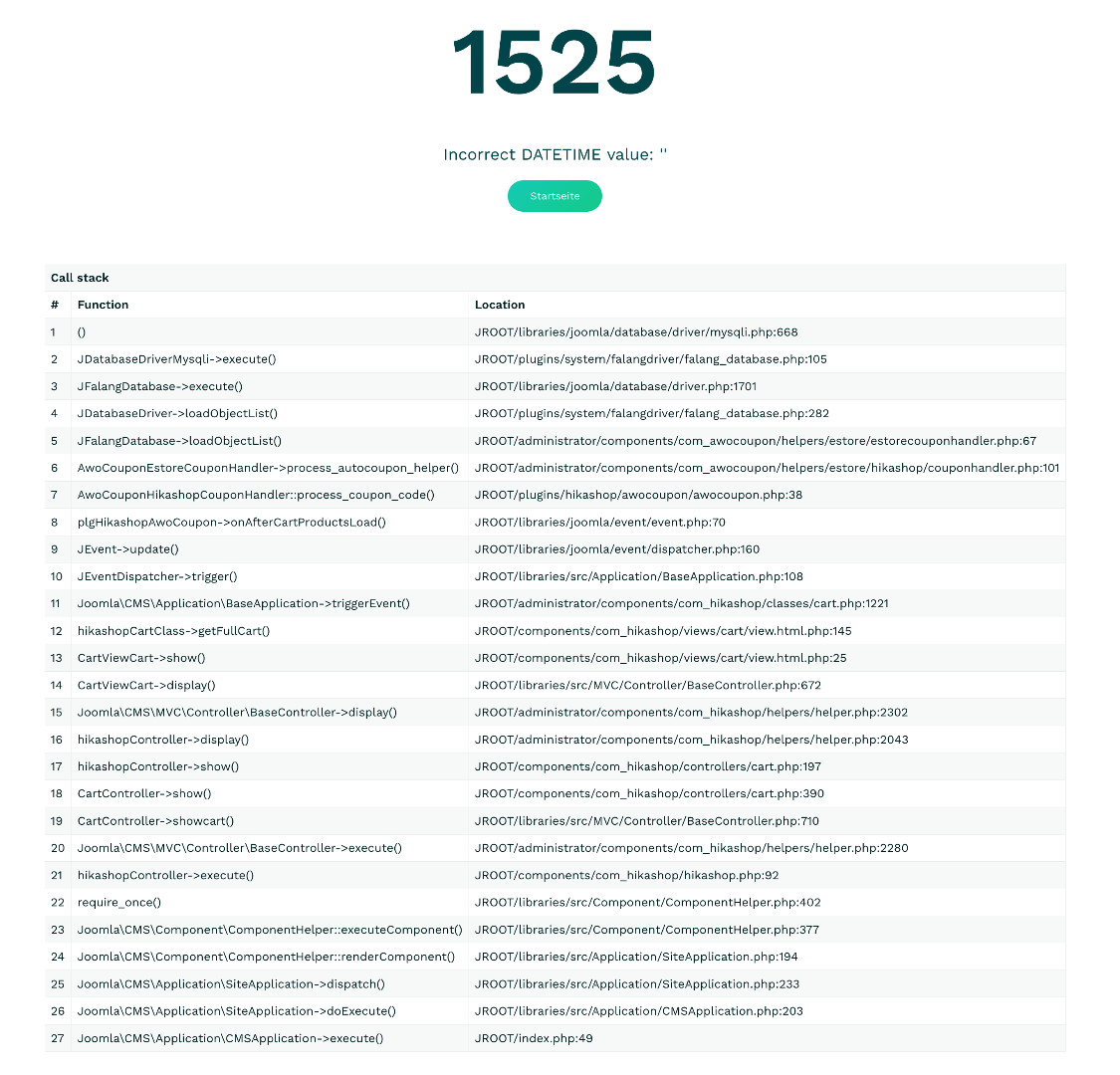 Seit dem neuesten Update funktioniert unser Warenkorb nicht mehr. Sowohl im Backend als auch im Frontend erscheint sobald man auf den Warenkorb klickt folgende Fehlermeldung: 1525 Incorrect DATETIME value: ''