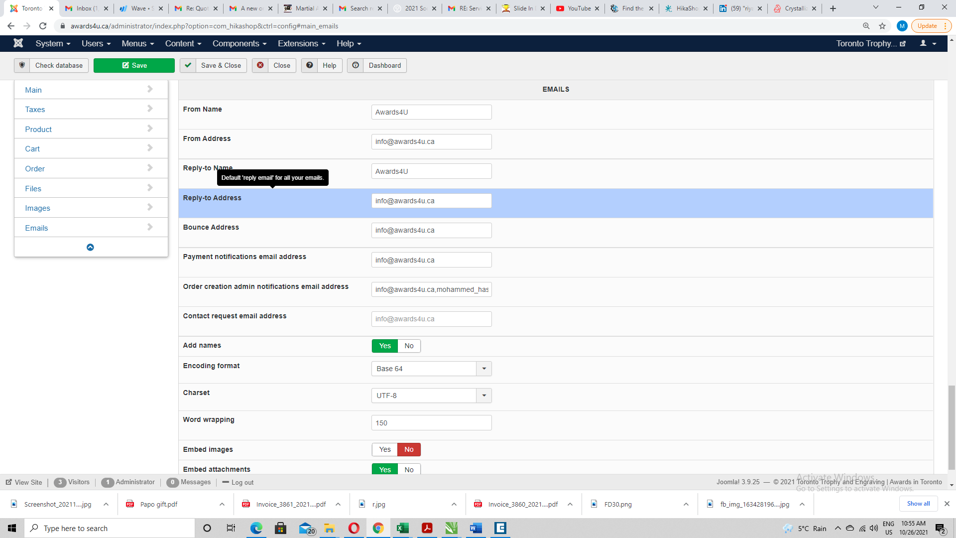 It's probably something related to the settings under the Emails section of the HikaShop configuration.