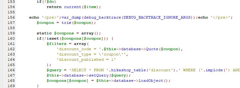Just before that line 157 in /administrator/components/com_hikashop/classes/discount.php and reproduce the error ?