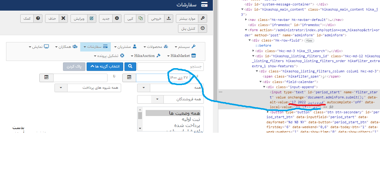 echo JHTML::_('calendar', hikashop_getDate((@$this->pageInfo->filter->filter_start?@$this->pageInfo->filter->filter_start:''),'%Y-%m-%d'), 'filter_start','period_start',hikashop_getDateFormat('%d %B %Y'),array('size'=>'10','onchange'=>'document.adminForm.submit();', 'onChange'=>'document.adminForm.submit();'));As you can see there, we call JHTML::_('calandar', ...) to display the date selector for the filter of the orders listing. This is the standard Joomla calendar selector.