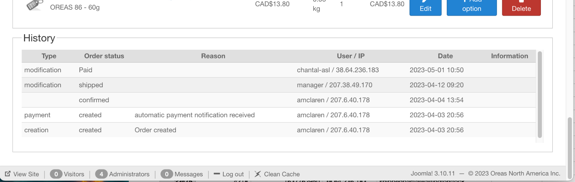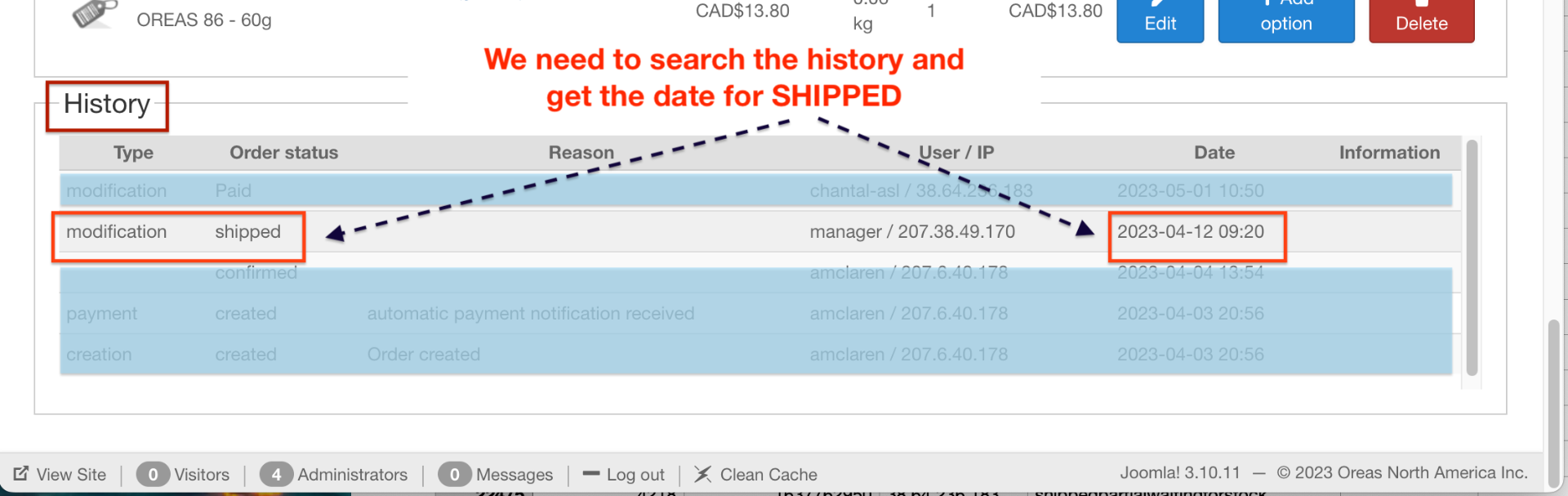 We do not need to make changes to the status. We want to get the information from the hikashop_history table that is found in the ORDER DETAILS screen. We need to get the date for previously shipped statuses.