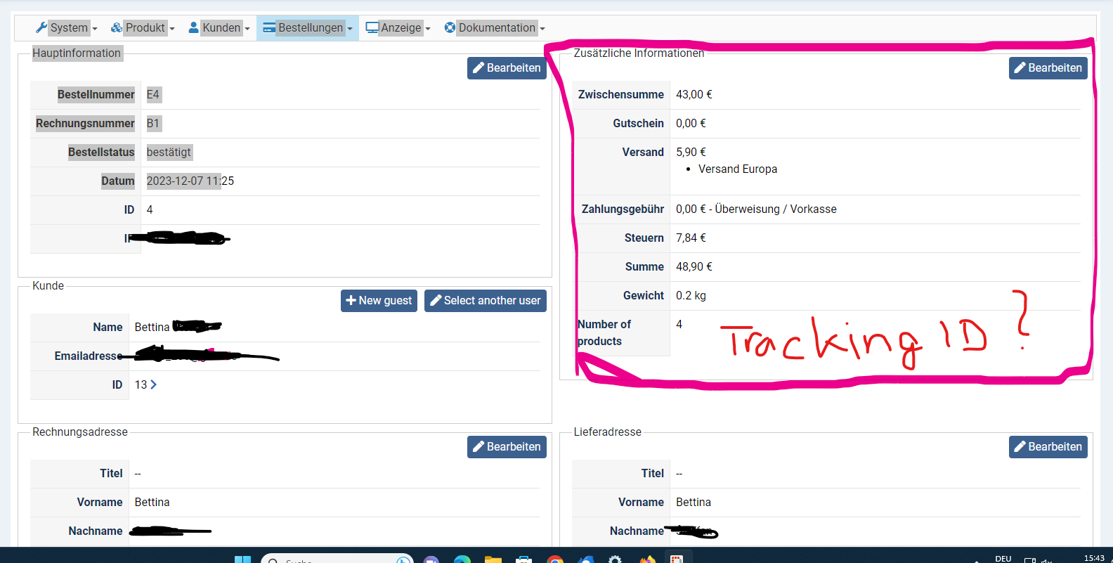 I need an idea where I can create and put a custom field which I can use for this case. For example, in the backend where I can open the order, there is an area with additional information (total amount, shipping, taxes, weight...) this would be ideal for editing the tracking ID.