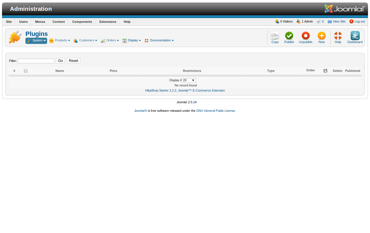 I just made a fresh Joomla + Hikashop install. I've enabled the Bank Transfer payment plugin in the Plugin manager, but there are currently no payment methods available in the Hikashop backend. The list is simply empty. I've followed your FAQ without any luck. Screenshots attached.