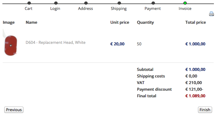 They pay € 900,00 for the products and get € 189,00 VAT added. Total € 1089,00 (€ 121,00 / 10% less)