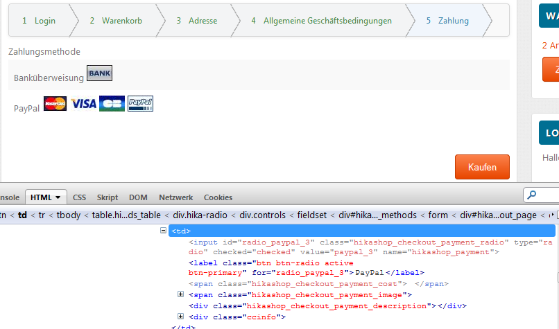I have set up two payment methods (bank transfer and PayPal) and normally there should be a radion button to select a method. But they are suddenly gone. Firebug shows the <input type ...> etc. but they are not visible. When I use no CSS (not default and not custom) they are visible. Please note the attached file, showing Firebug-HTML and the result.