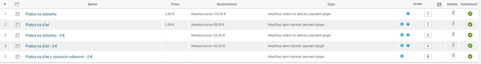 - hika_methods: list of payment methods (2x collect on delivery with different pricing, 2x bank transfer with different pricing, 1x bank transfer with special pickup place