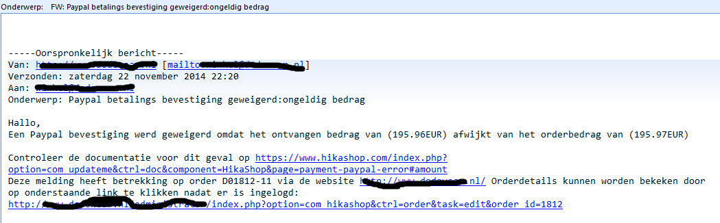 Array ( [option] => com_hikashop [ctrl] => checkout [task] => notify [notif_payment] => paypal [tmpl] => component [lang] => nl [Itemid] => 521 [mc_gross] => 51.71 [invoice] => 1857 [protection_eligibility] => Ineligible [address_status] => unconfirmed [item_number1] => 1037745 [tax] => 8.32 [item_number2] => 1037761 [payer_id] => *********[item_number3] => 1037714 [address_street] => Bernhardstraat 12 [item_number4] => [payment_date] => 15:38:57 Jan 01, 2015 PST [payment_status] => Completed [charset] => windows-1252 [address_zip] => ****** [mc_shipping] => 0.00 [mc_handling] => 0.00 [first_name] => ****** [mc_fee] => 2.11 [address_country_code] => NL [address_name] => ****** ****** [notify_version] => 3.8 [custom] => [payer_status] => unverified [business] => This email address is being protected from spambots. You need JavaScript enabled to view it. [address_country] => Netherlands [num_cart_items] => 4 [mc_handling1] => 0.00 [mc_handling2] => 0.00 [mc_handling3] => 0.00 [address_city] => Brandwijk [mc_handling4] => 0.00 [verify_sign] => A.DHiEWB7nkqY2AbQeth67ia4T1zANCoGwsCzaR3AXV7hpeYWPkAgf0h [payer_email] => **********@hotmail.com [mc_shipping1] => 0.00 [mc_shipping2] => 0.00 [mc_shipping3] => 0.00 [mc_shipping4] => 0.00 [txn_id] => 05R03806VC8973045 [payment_type] => instant [last_name] => Pijcke [address_state] => [item_name1] => Z8 Babybroek Chinchilla Marine: 56 [receiver_email] => This email address is being protected from spambots. You need JavaScript enabled to view it. [item_name2] => Z8 Babyjurkje Hummingbird Roze: 56 [payment_fee] => [item_name3] => Z8 Babyvest gebreid Roze: 56 [item_name4] => Verzenden [quantity1] => 1 [quantity2] => 1 [receiver_id] => GNL7NGR7LCAM8 [quantity3] => 1 [txn_type] => cart [quantity4] => 1 [mc_gross_1] => 11.13 [mc_currency] => EUR [mc_gross_2] => 13.61 [mc_gross_3] => 14.85 [residence_country] => NL [receipt_id] => 0832-7256-6873-6412 [mc_gross_4] => 3.80 [transaction_subject] => [payment_gross] => [ipn_track_id] => 372a73cd3b1e8 [hikashop_front_end_main] => 1 [view] => checkout ) stdClass Object ( [order_id] => 1857 [order_billing_address_id] => 3536 [order_shipping_address_id] => 3536 [order_user_id] => 2432 [order_status] => created [order_discount_code] => [order_created] => 1420155478 [order_ip] => 86.85.128.147 [order_currency_id] => 1 [order_shipping_price] => 3.80000 [order_discount_price] => 0.00000 [order_shipping_id] => 11 [order_shipping_method] => manual [order_payment_id] => 2 [order_payment_method] => paypal [order_full_price] => 51.68750 [order_modified] => 1420155478 [order_partner_id] => 0 [order_partner_price] => 0.00000 [order_partner_paid] => 0 [order_type] => sale [order_partner_currency_id] => 0 [order_shipping_tax] => 0.00000 [order_discount_tax] => 0.00000 [order_number] => D01857-01 [order_tax_info] => Array ( [BTW 21] => stdClass Object ( [tax_namekey] => BTW 21 [tax_rate] => 0.21000 [tax_amount] => 8.3110545 ) ) [order_vm_id] => [order_payment_price] => 0.00000 [order_invoice_id] => 0 [order_invoice_number] => [order_invoice_created] => 0 [order_shipping_params] => stdClass Object ( [prices] => Array ( [11@0] => stdClass Object ( [price_with_tax] => 3.80000 [tax] => 0 ) ) ) [order_payment_params] => [order_site_id] => ) Array ( [scheme] => https [host] =>