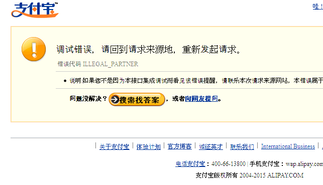 -- Error-message(debug-mod must be tuned on) -- : Alipay Payment method configured but giving error message as "ILLEGAL PARTNER" on Alipay page