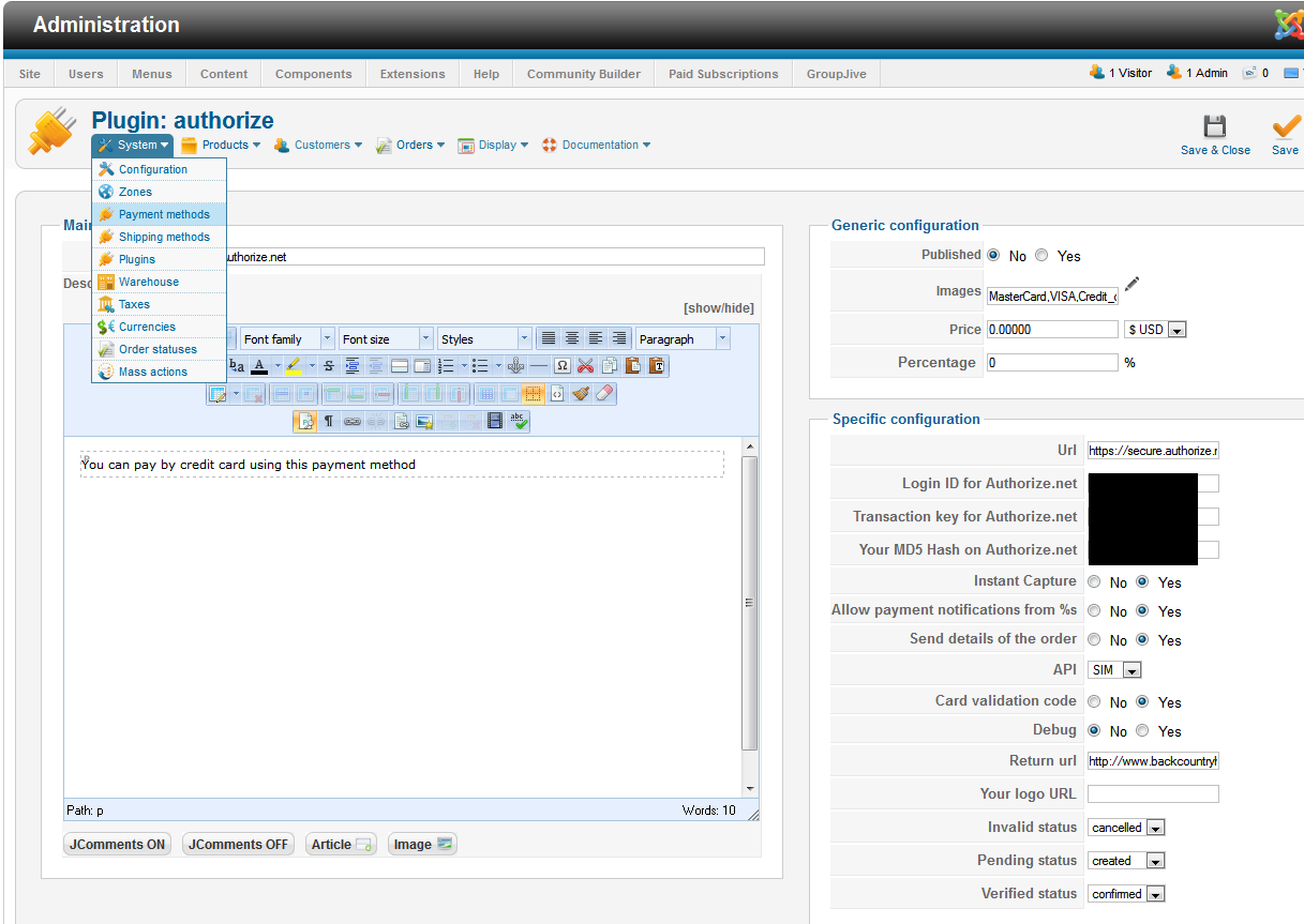 - Check that the debug mode option is ON through your Authorize.net payment configuration page
