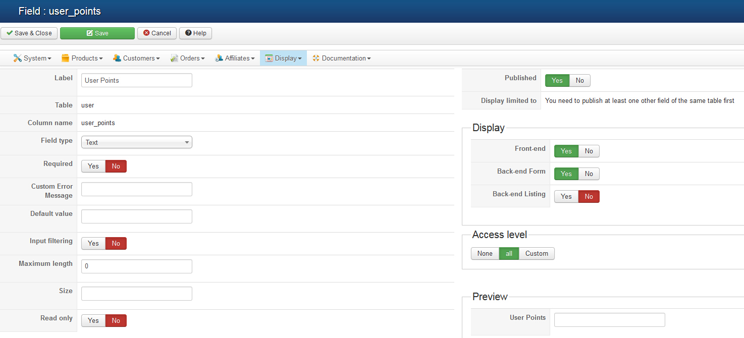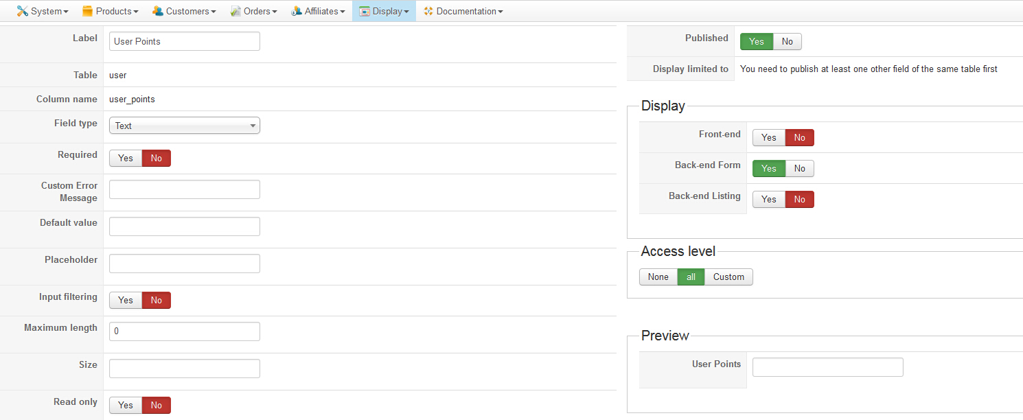 You should also change the configuration of the "user_points" custom field to not display it in the front-end ; otherwise the user will be able to modify his points himself and I don't think that you want to allow that.