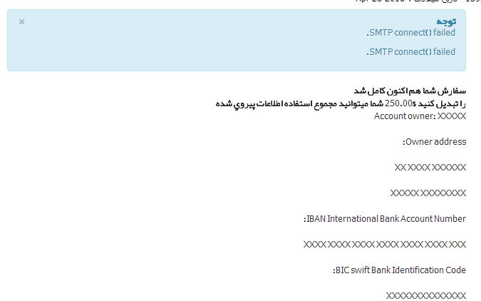 SMTP connect failed by Bank Transfer Method