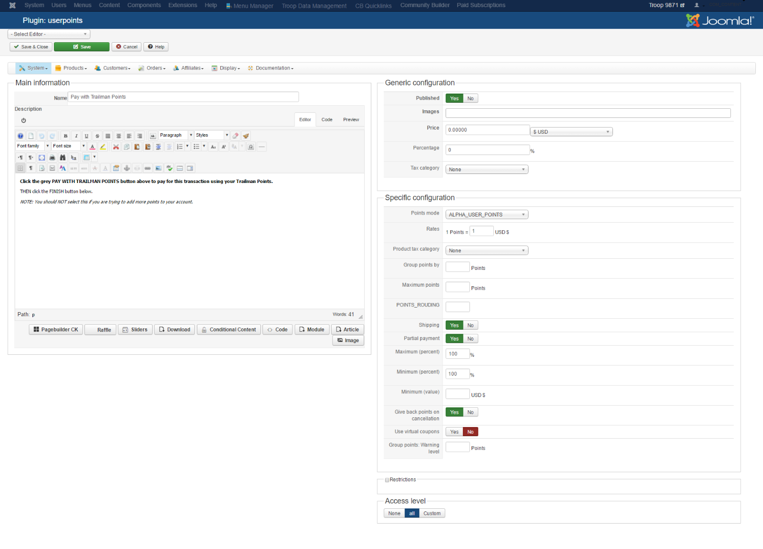 Third, we are not 'earning' any points (we are only paying with points), so I did not follow any of the instructions in the 'Earning' section. Yet you are now telling me that I should. I'm just very confused with all these instructions (and I'm 10-year Joomla! user with programming experience).